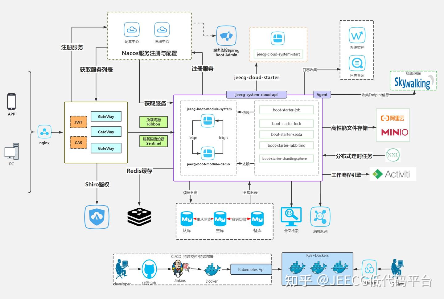 - 3.支持微服务Spring Cloud Alibaba(Nacos、Gateway、Sentinel、Skywalking),提供简易机制,支持单体和微服务自由切换(这样可以满足各类项目需求)。